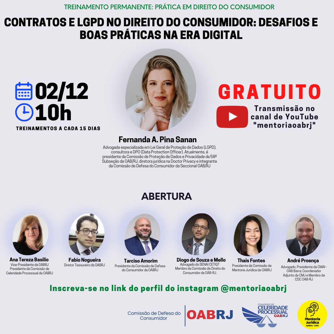 Vice-presidente da OAB-RJ, Ana Tereza Basílio vai proferir a palestra de abertura, na segunda, dia 2 de dezembro, às 10h, do Treinamento Permanente: Prática em Direito do Consumidor, pelo canal YouTube mentoriaoabrj, com o tema ” Contratos e LGPD (Lei Geral de Proteção de Dados) no Direito do Consumidor: Desafios e Boas Práticas na Era Digital “.