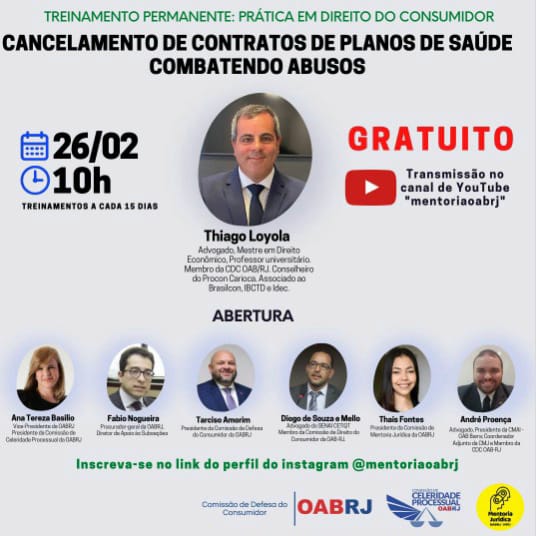 Também estarão no encontro virtual, o advogado Thiago Loyola, o procurador-geral da OAB-RJ, Fábio Nogueira, o presidente da comissão de Defesa do Consumidor, Tarciso Amorim, a comissão de Mentoria Jurídica da seccional, Thais Fontes, e o advogado André Proença.