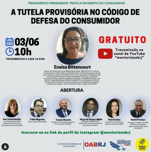 Também estarão no encontro virtual, o Diretor tesoureiro da OAB-RJ, Fabio Nogueira, o presidente da comissão de Defesa do Consumidor, Tarciso Amorim, a presidente da comissão de Mentoria Jurídica, Thais Fontes, e os advogados André Mendonça, Diogo de Souza e Mello e Eneisa Bittencourt.