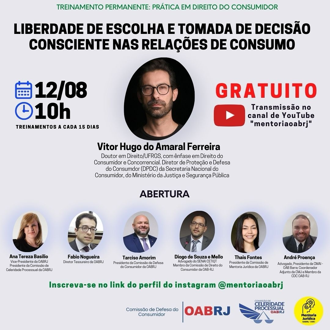 Também estarão no encontro virtual, o doutor em Direito pela UFRGS, Vitor Hugo Amaral Ferreira, o Diretor Tesoureiro, Fabio Nogueira, o presidente da comissão de Defesa do Consumidor , Tarciso Amorim, a presidente da comissão de Mentoria Jurídica, Thais Fontes, e os advogados Diego de Souza e Mello, e André Proença.