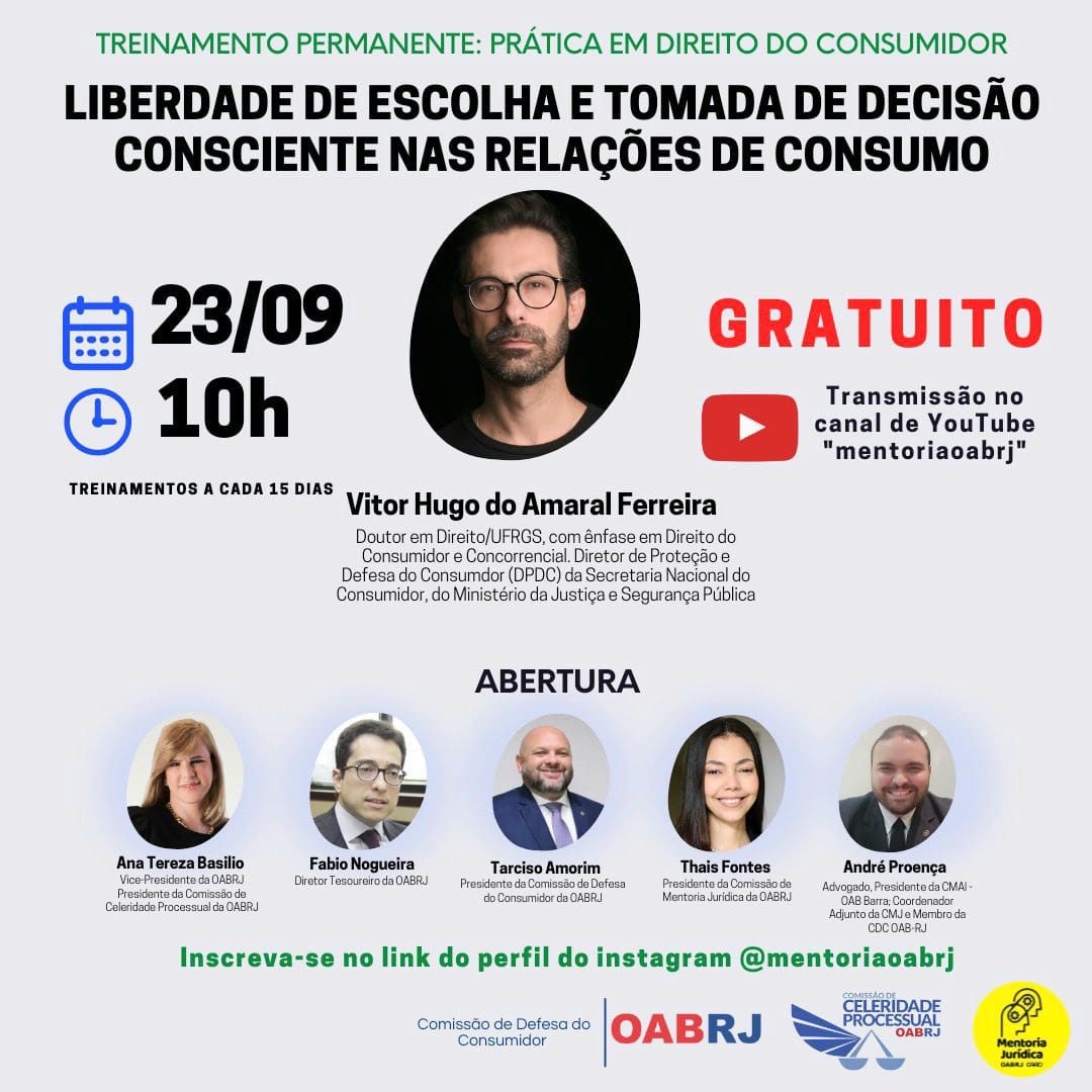 Também estarão no encontro virtual. o diretor tesoureiro da OAB-RJ, Fabio Nogueira, o presidente da comissão de Defesa do Consumidor, Tarciso Amorim, a presidente da comissão de Mentoria Jurídica, Thais Fontes, e os advogados André Mendonça e Vitor Hugo do Amaral Ferreira.