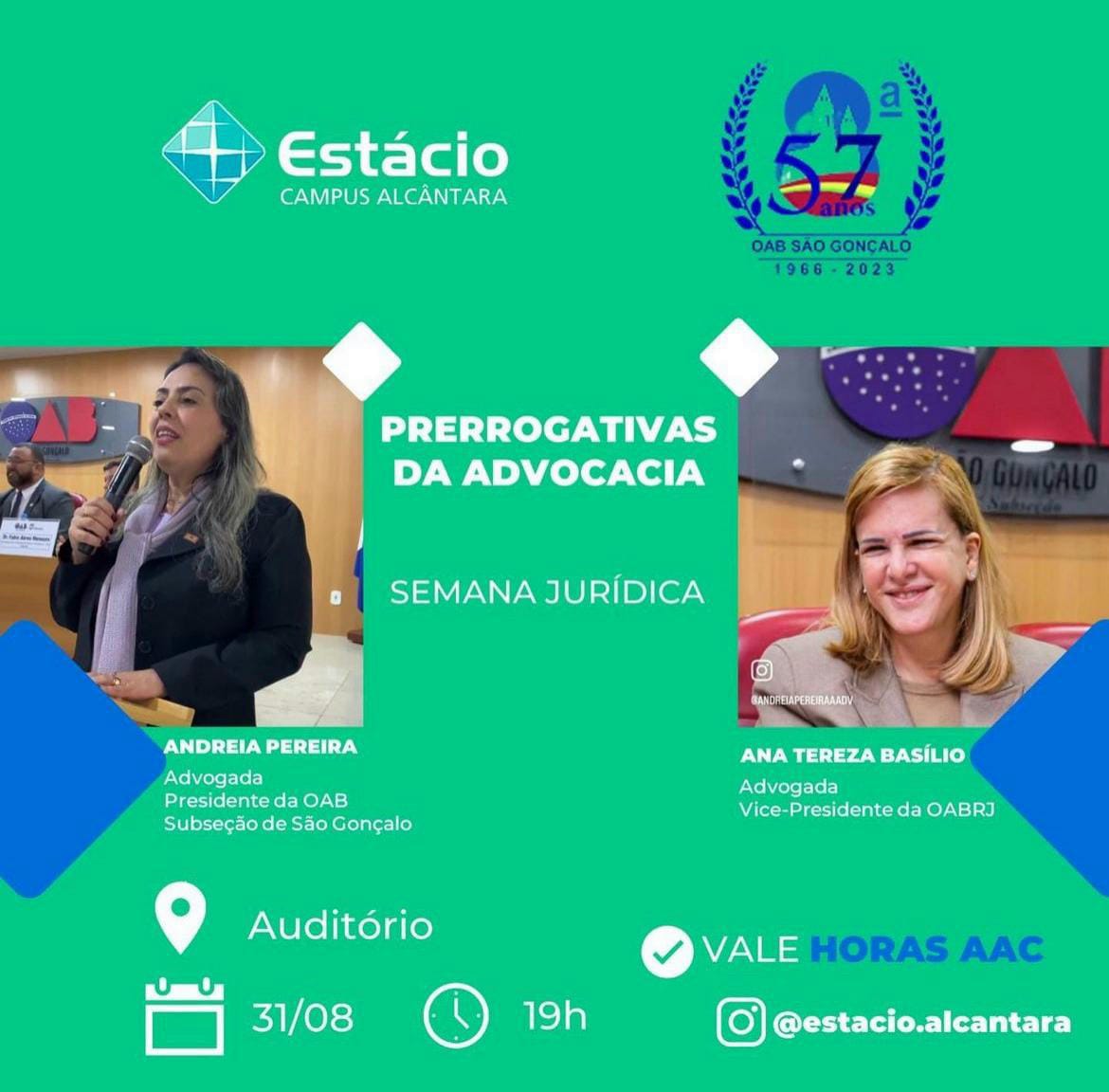 O tema das palestras de Ana Tereza Basilio e Andreia Pereira é “Prerrogativas da Advocacia”.