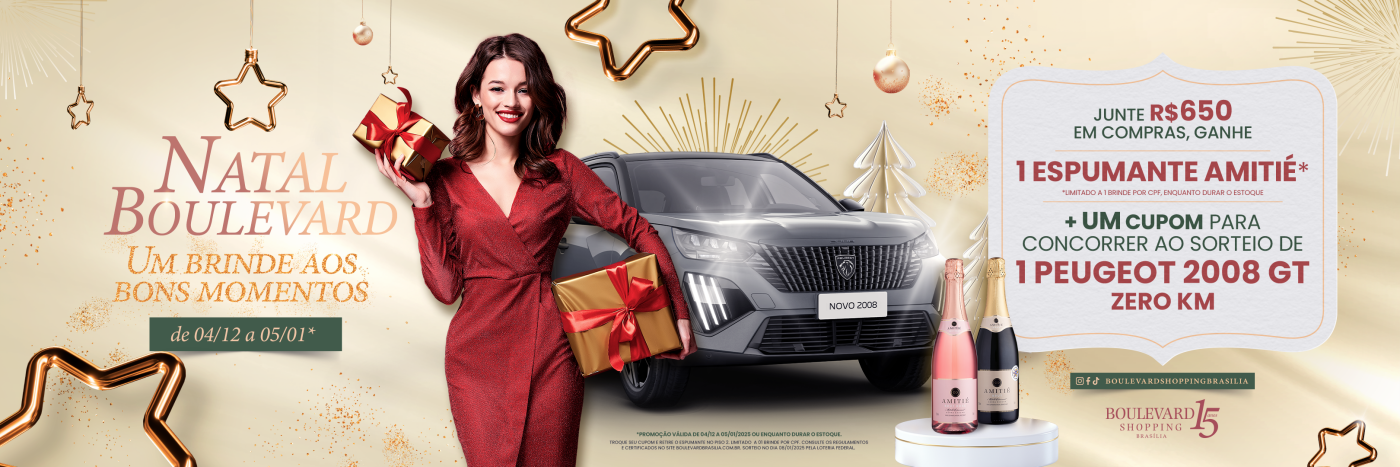 De 04 de dezembro a 05 de janeiro, juntando R$ 650 em compras, os clientes ganham um delicioso Espumante Amitié Brut ou Rosé, à escolha do cliente. Limite de 01 brinde por CPF, enquanto durar o estoque. O balcão para a retirada do brinde está localizado no piso 1. Além de garantirem um cupom eletrônico para concorrer ao novo Peugeot 2008 GT, na cor cinza18h30. Para participar do sorteio, os interessados devem cadastrar seus cupons fiscais no site www.boulevardbrasilia.com.br/promocoes. O sorteio será realizado no dia 08 de janeiro de 2025 pela Extração da Loteria Federal. Confira regulamento completo em www.boulevardbrasilia.com.br.