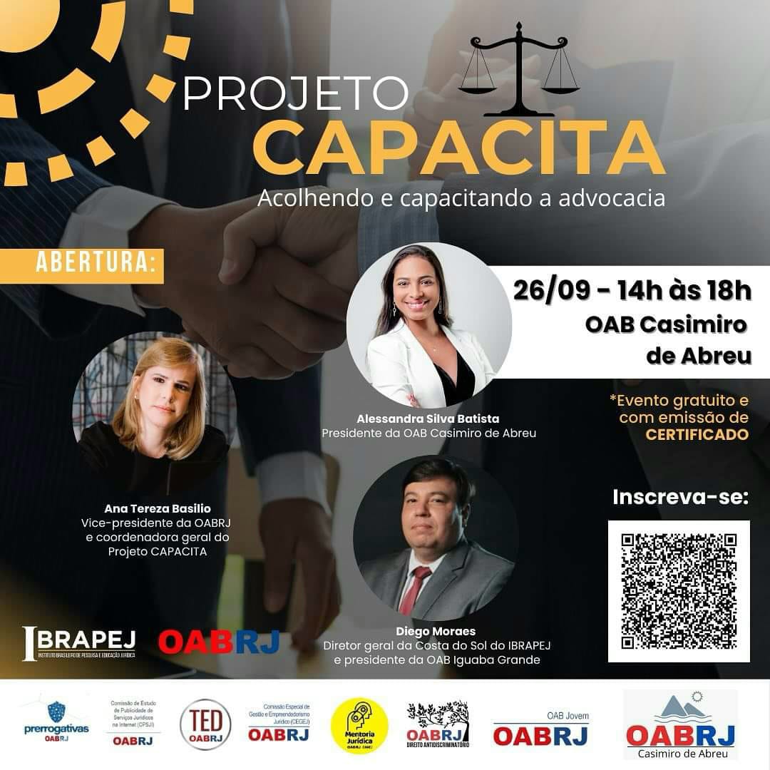Também vão participar do evento presencial,  a presidente da OAB de Casimiro de Abreu,  Alessandra Silva Batista, e o diretor geral da Costa do Sol do IBRAPEJ e presidente da OAB de Iguaba Grande,  Diego Moraes.