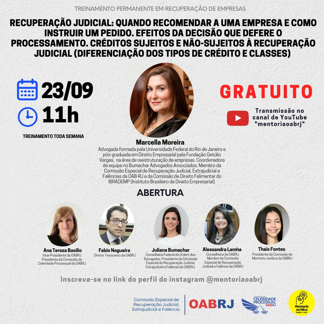 Vice-presidente da OAB-RJ e presidente da comissão de celeridade processual, Ana Tereza Basílio vai participar, na próxima segunda-feira, dia 23, às 11h, do Treinamento Permanente em Recuperação de Empresas, pelo canal YouTube mentoriaoabrj, com o tema ” Recuperação Judicial: Quando recomendar a uma empresa e como instruir um pedido. Efeitos da decisão que defere processamento, créditos sujeitos e não sujeitos à recuperação judicial (diferenciação dos tipos de crédito e classes)” .