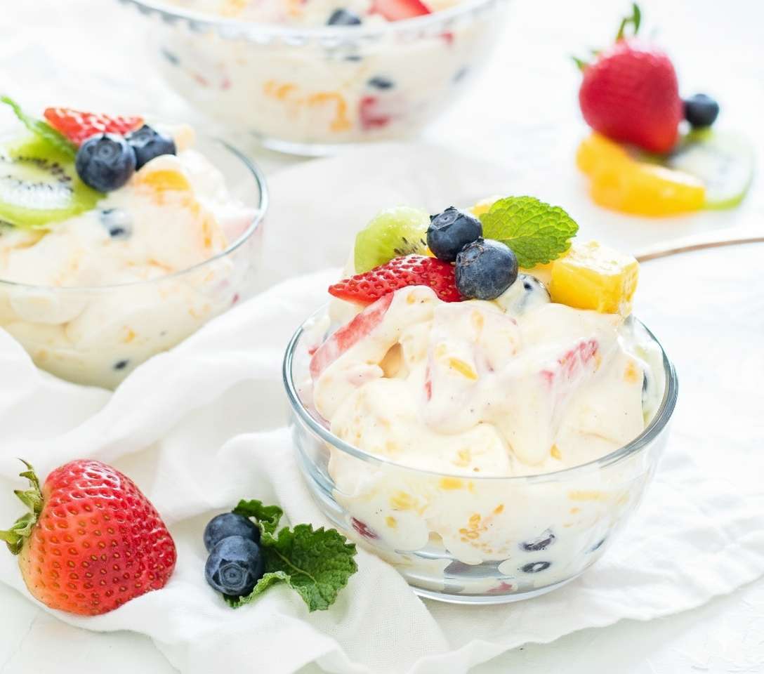 Em um pote separado, misture um recipiente de leite condensado e creme de leite Marajoara até obter uma mistura homogênea. Depois, despeje o creme na tigela com as frutas e misture delicadamente, envolvendo toda a receita com a mistura cremosa.
