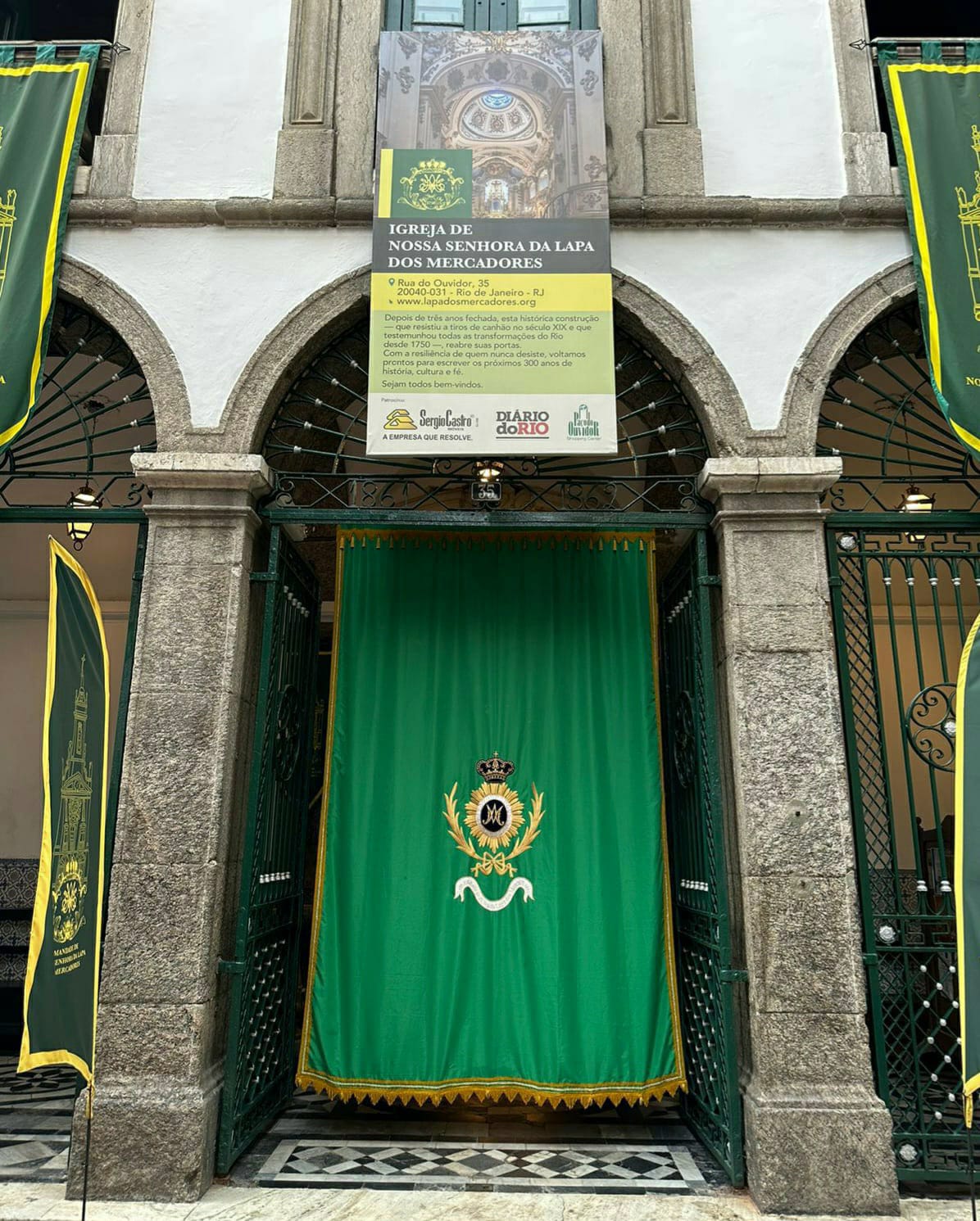 “É o uso do pano bordado, na entrada principal da igreja. Essa tradição deixou de ser adotada, há alguns anos, mas ainda existe em algumas igrejas de Minas Gerais. Agora, decidimos resgatar o uso do pano bordado, na igreja de Nossa Senhora da Lapa dos Mercadores. Ele já estará na porta da igrejinha, neste sábado, na missa que o padre Vitor Pereira vai celebrar, às 12h, com bênção aos comerciantes”, disse Claudio André Castro, comissário administrativo da Irmandade de Nossa Senhora da Lapa dos Mercadores.