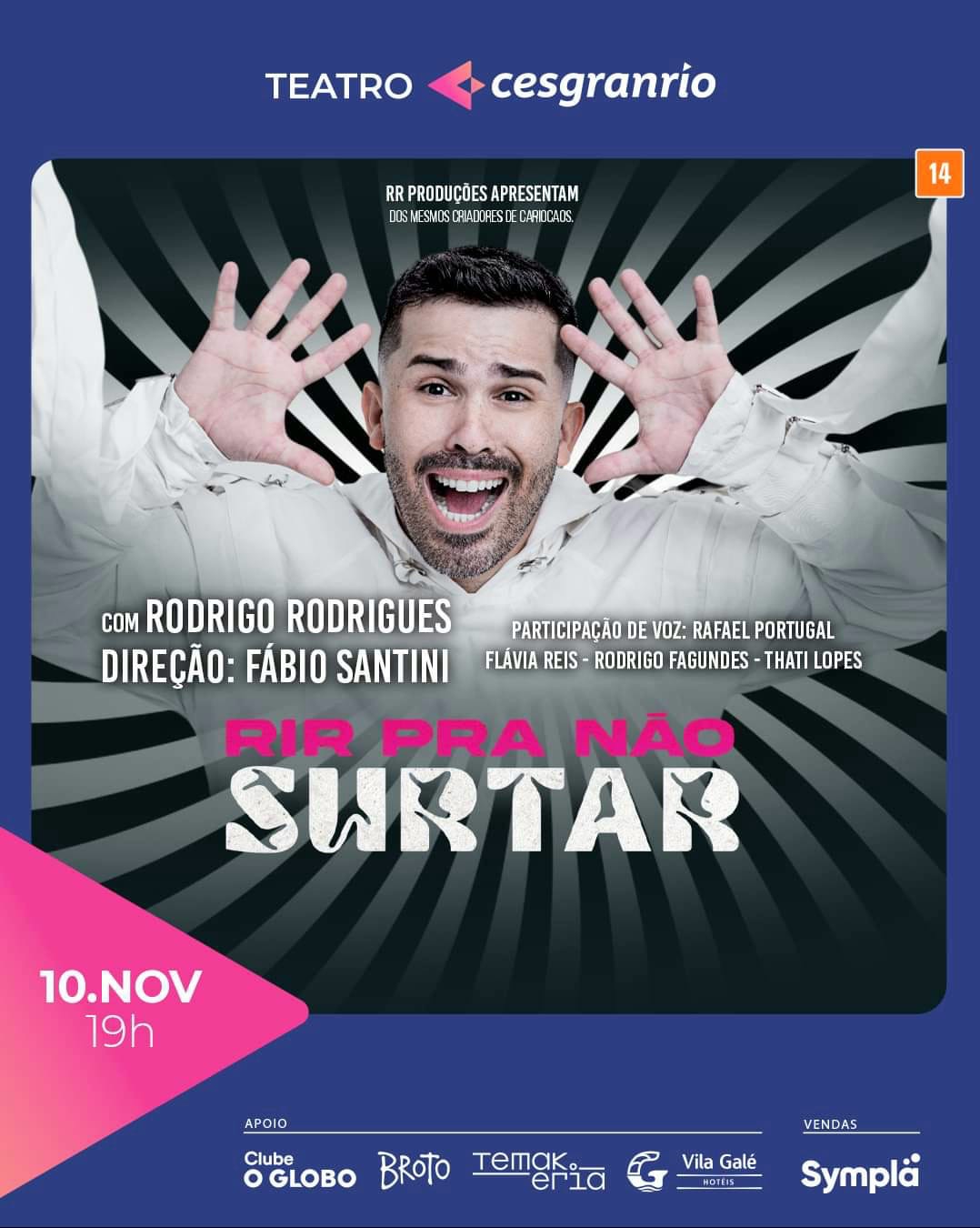 Criado por Carlos Alberto Serpa, o Teatro Cesgranrio (Rua Santa Alexandrina número 1011) vai receber,  neste domingo,  dia 10 de novembro, às 20h,  o espetáculo ” Rir para não surtar “, dos mesmos criadores da comédia Cariocaos,  com Rodrigo Rodrigues e direção de Fábio Santini.