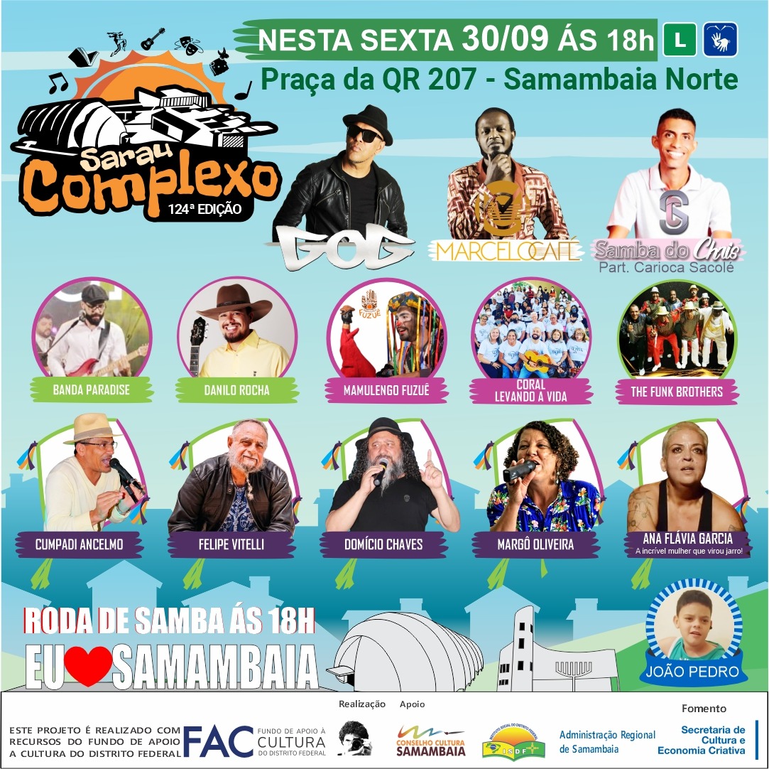 Celebrando mais uma edição do tradicional Sarau Complexo, que acontece nesta sexta-feira , dia 30/9, na praça da quadra 207 de Samambaia Norte, o Conselho de Cultura de Samambaia juntamente com o movimento cultural convidou artistas de vários cantos do Distrito Federal para se apresentarem para a Comunidade da região administrativa.