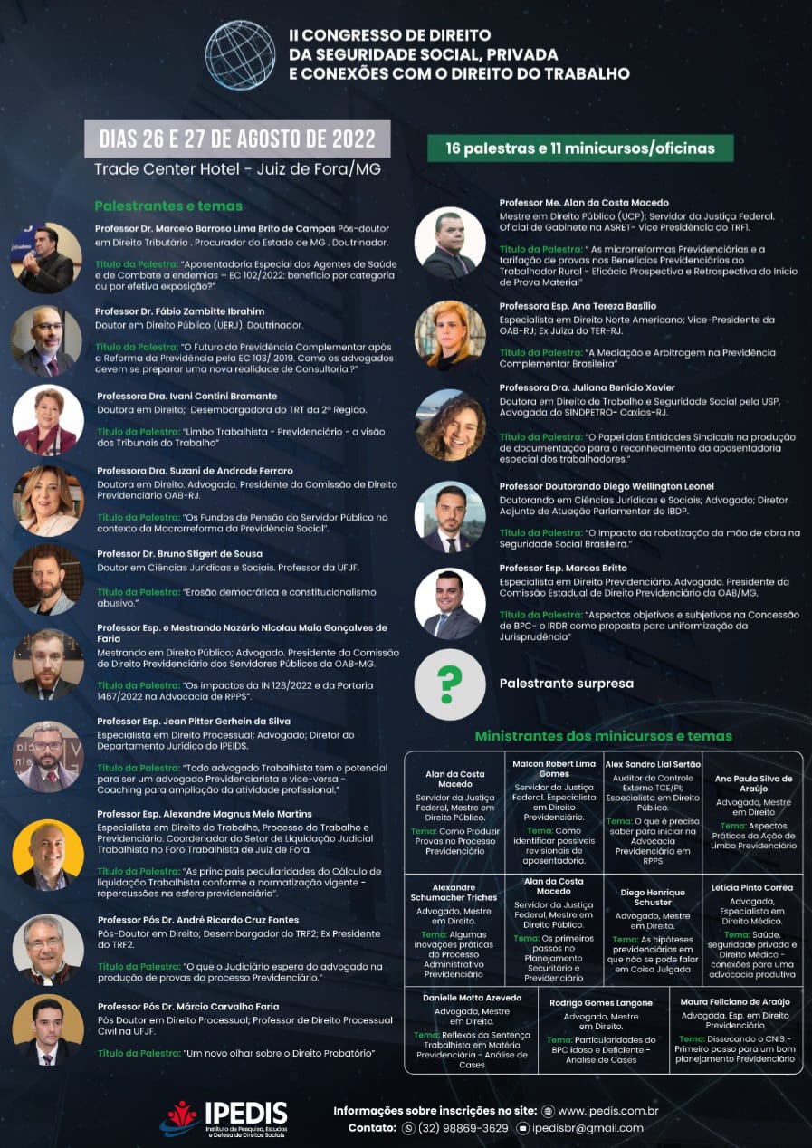 Informações e Inscrições no site do Instituto de Pesquisa, Estudos e Defesa de Direitos Sociais (Ipedis), www.ipedis.com.br.