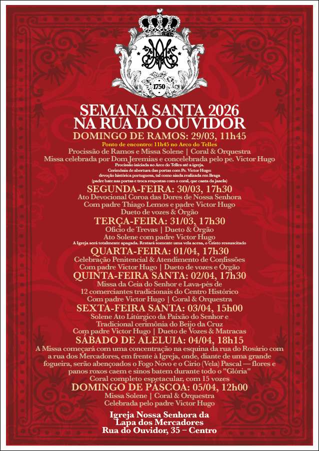 A celebração do sábado de Aleluia, no dia 4 de abril, será às 18h15, fora da igreja, na esquina da Rua do Rosário com a Rua dos Mercadores, diante de uma grande fogueira com as bênçãos do Fogo Novo e do Círio Pascal. O Domingo de Páscoa, no dia 5 de abril, com Missa Solene às 12h, celebrada pelo padre Victor Hugo, encerra a programação da Semana Santa, aberta ao público.