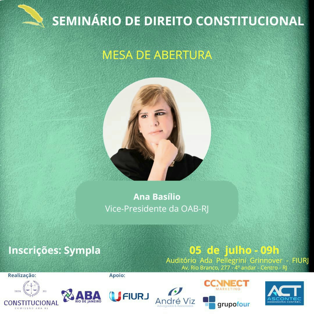 Vice-presidente da OAB-RJ e presidente da comissão de celeridade processual,  Ana Tereza Basílio fará a palestra de abertura do Seminário de Direito Constitucional,  nesta sexta, às 9h, no Auditório Ada Pellegrini Grinnover,  na FIURJ ( Avenida Rio Branco 277, quarto andar).