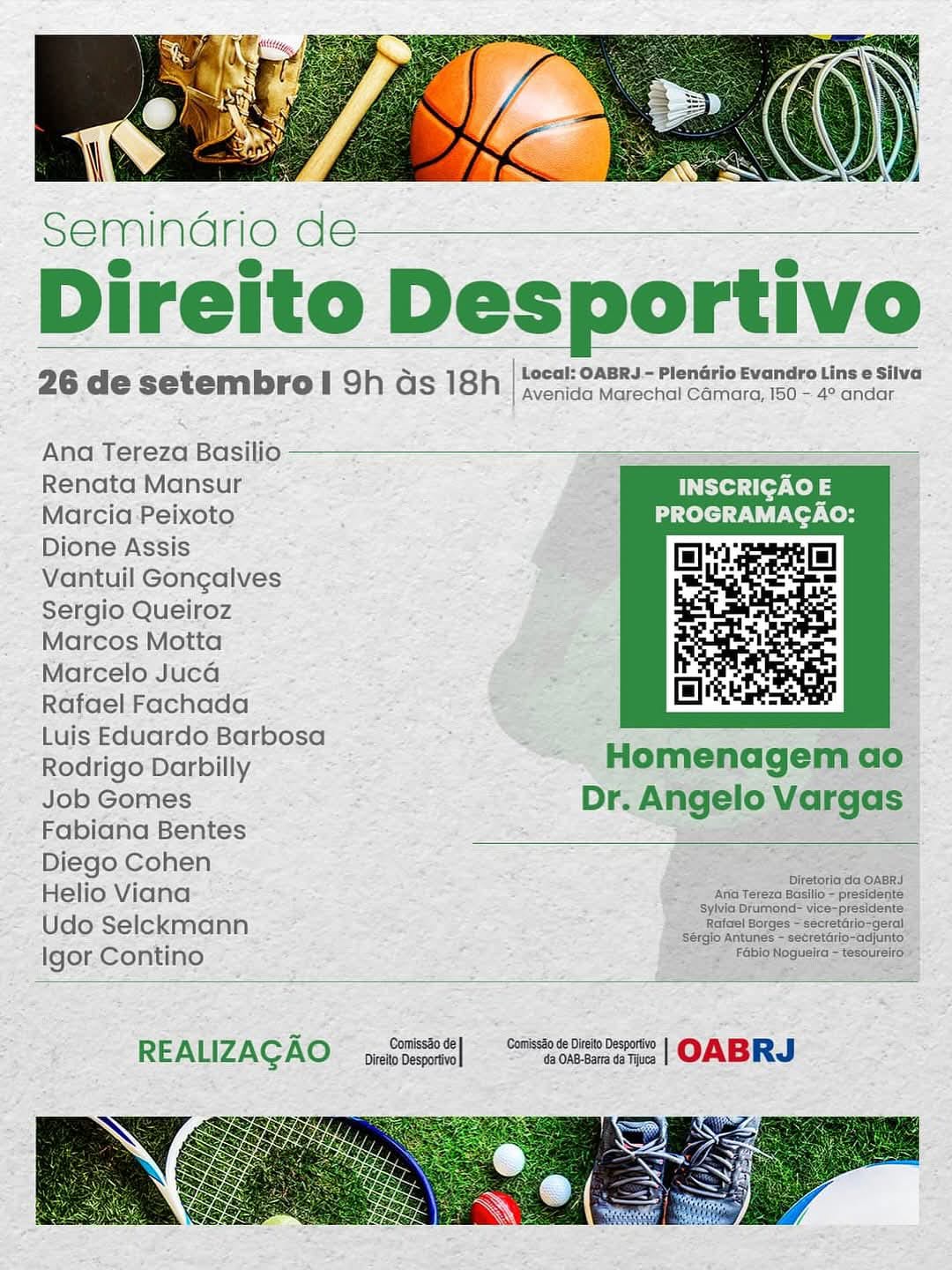 Na ocasião,  será feita uma homenagem ao primeiro Titular de Direito Desportivo do Brasil, professor Angelo Vargas.
