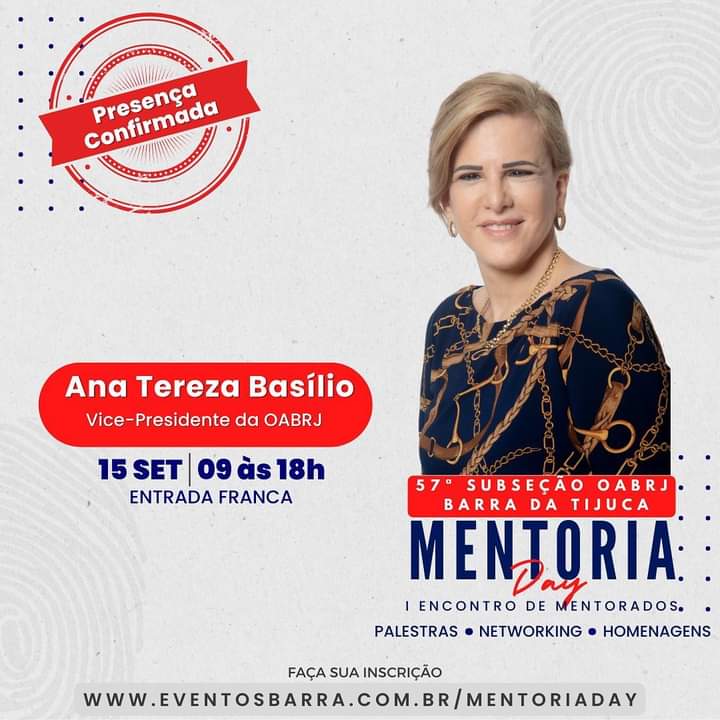 Em seguida, Ana Tereza Basílio faz a abertura do I Encontro de Mentorados, no auditório do Condomínio Absolutto Businews Towers, com os advogados Manoela Dourado, Marcus Soares, Patrícia Pacheco e Carlos Gabriel Feijó, da OAB da Barra da Tijuca.