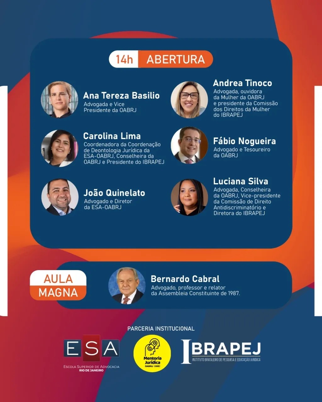 Também estarão presentes, o secretário-geral da ESA, João Quinelato, a presidente do IBRAPEJ, Carolina Lima, o Diretor Tesoureiro da OAB-RJ, Fabio Nogueira, e as advogadas Andrea Tinoco e Luciana Silva.