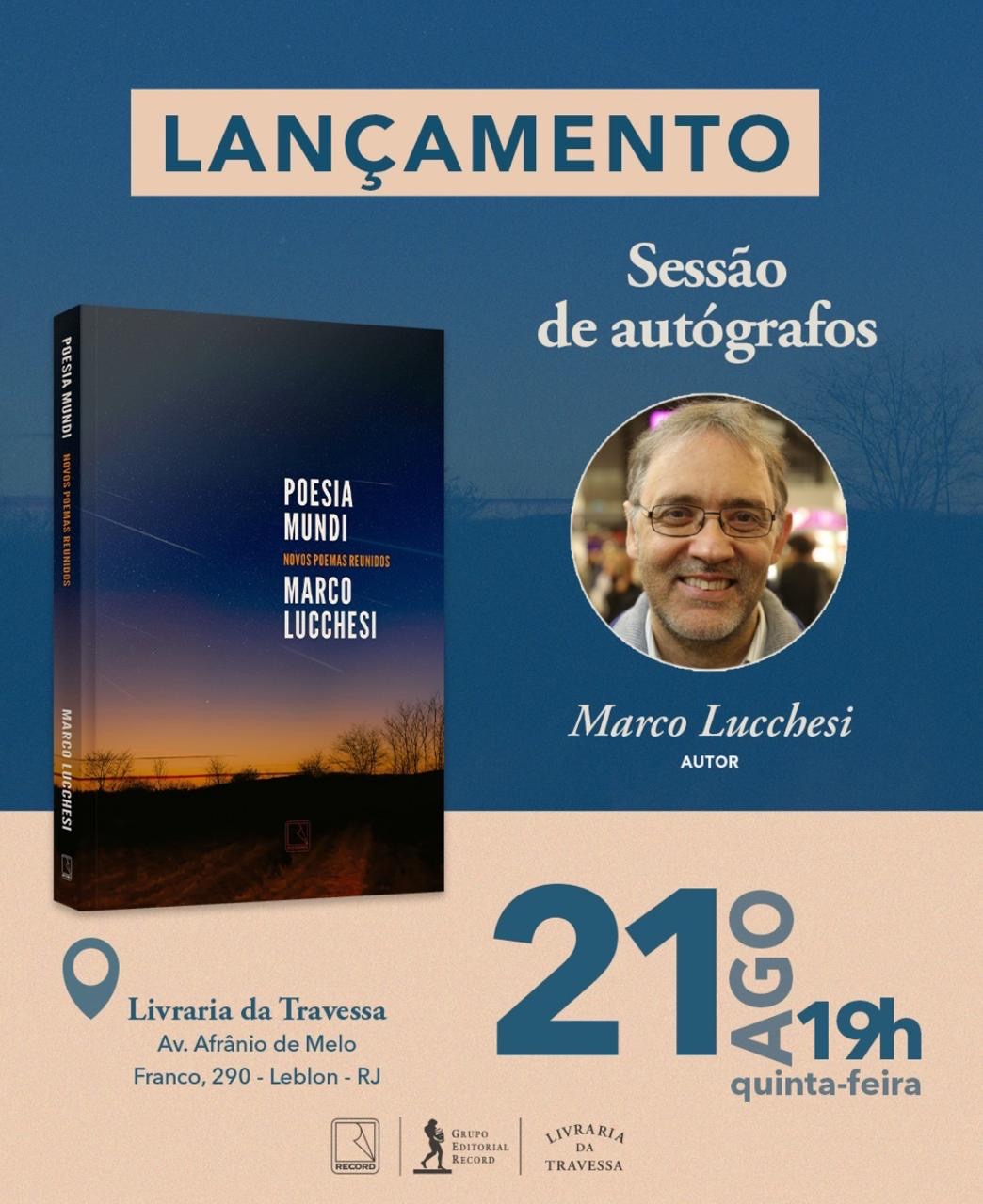 O acadêmico Marco Lucchesi, ex- presidente da ABL, que é, também, membro do Grupo de Trabalho do Centro Alceu Amoroso Lima para Liberdade (fundado por Cândido Mendes e dirigido por Maria Helena Arrochellas), lança, nesta quinta-feira, dia 21 de agosto, às 19h, na Livraria da Travessa do Shopping Leblon, o seu mais novo livro, “Poesia Mundi” (Editora Record).