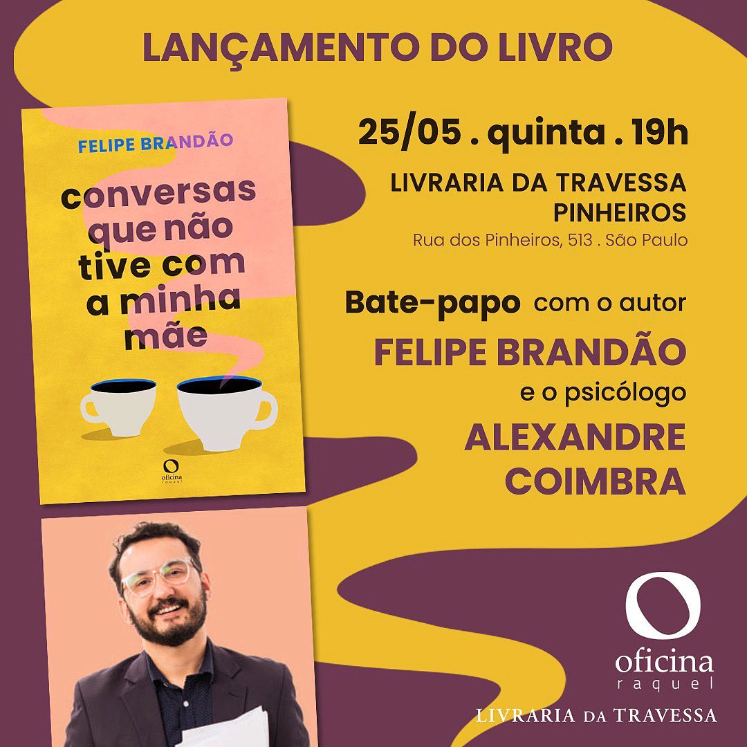 Na próxima quinta-feira, dia 25 de maio, o escritor e editor de livros Felipe Brandão lança Conversas que não tive com a minha mãe, na Livraria Travessa Pinheiros. Marcada para as 19h, a sessão de autógrafos também terá mesa de bate-papo com o autor e a presença do psicólogo e palestrante Alexandre Coimbra – que assina o livro “Cartas de um terapeuta para seus momentos de crise”.