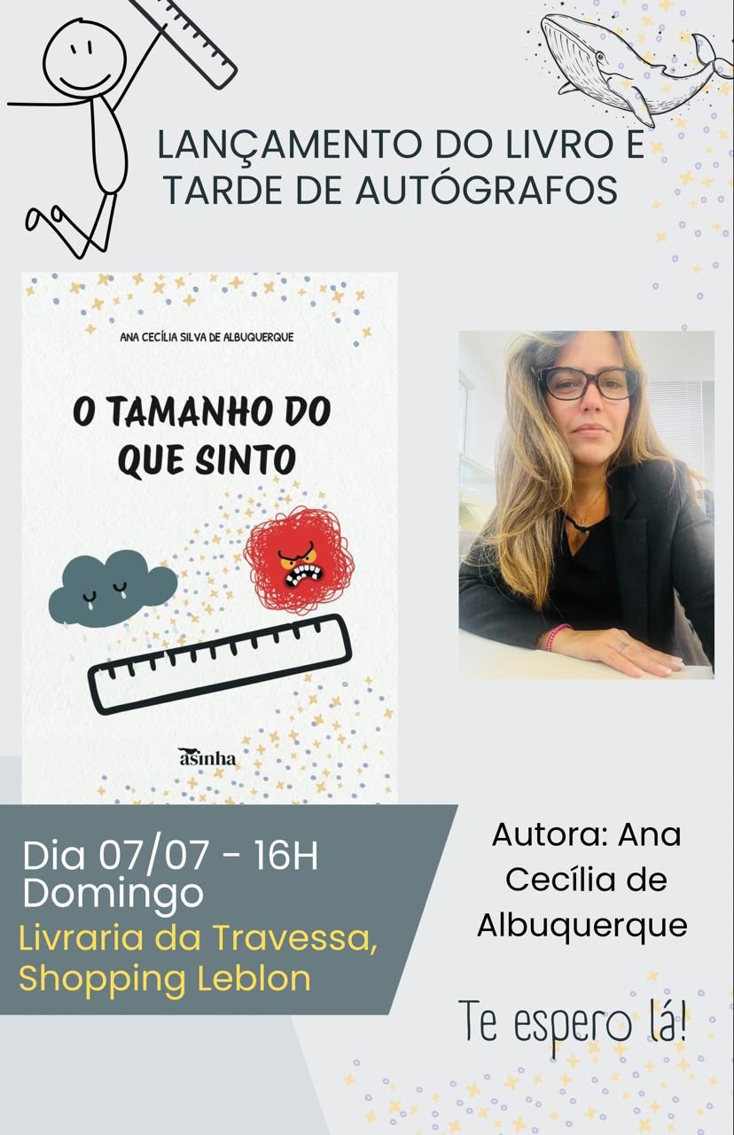 Ana Cecília Albuquerque ( foto) convida para o lançamento de seu livro infantil, “O Tamanho do que sinto “, no dia 7 de julho, em tarde de autógrafos que vai acontecer na Livraria da Travessa do Shopping Leblon, a partir das 16h.