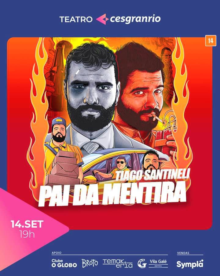 Criado por Carlos Alberto Serpa, o Teatro Cesgranrio ( Rua Santa Alexandrina número 1011, Rio Comprido) vai receber, neste sábado, dia 14 de setembro, às 19h, o espetáculo ” Pai da Mentira “, com o humorista e ator Tiago Santineli.