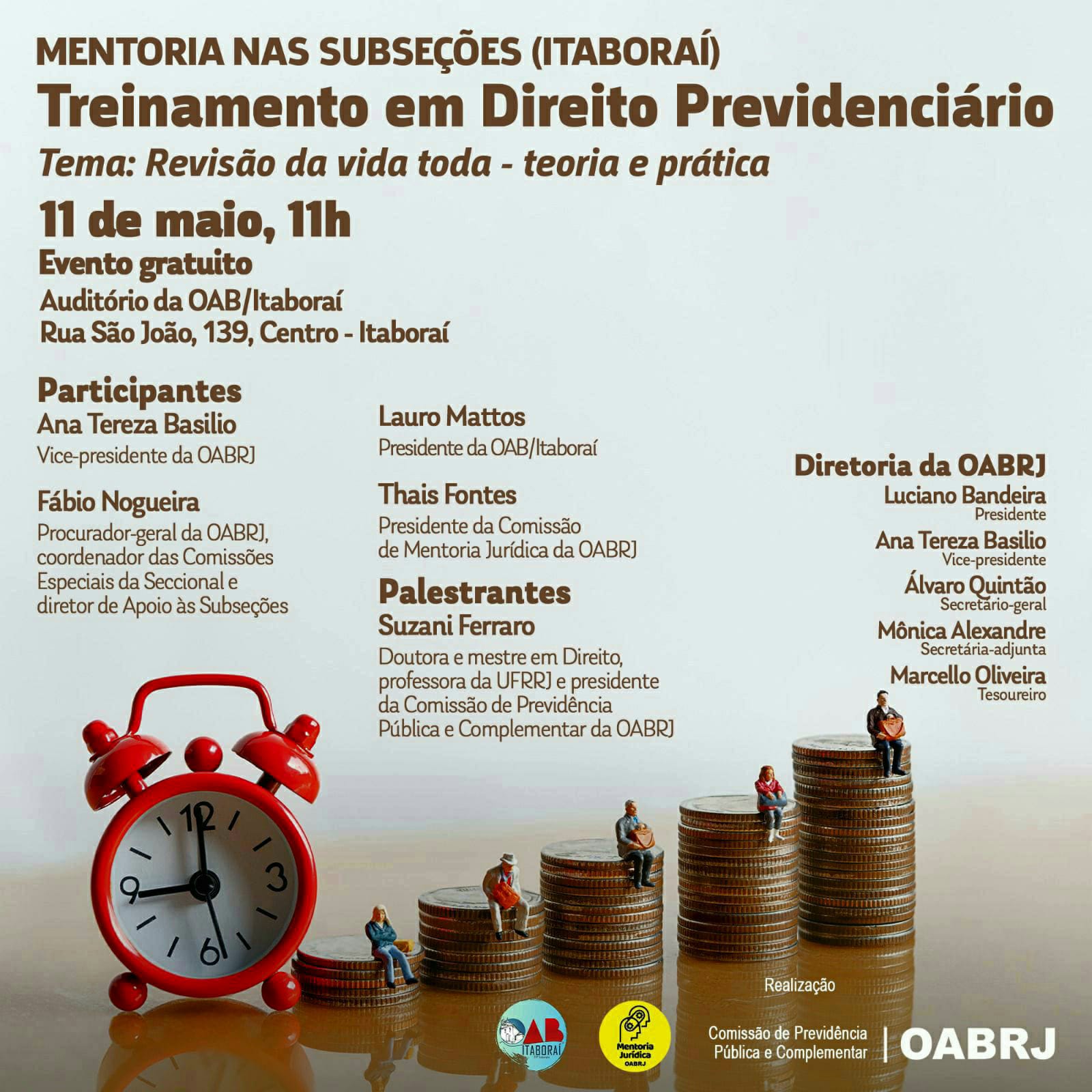 Também estarão no encontro presencial, o procurador-geral da OAB-RJ, Fábio Nogueira, a presidente da comissão de Mentoria Jurídica, Thais Fontes, o presidente da OAB de Itaboraí, Lauro Mattos, e a palestrante Suzani Ferraro, presidente da comissão de Previdência Pública e Complementar da seccional.