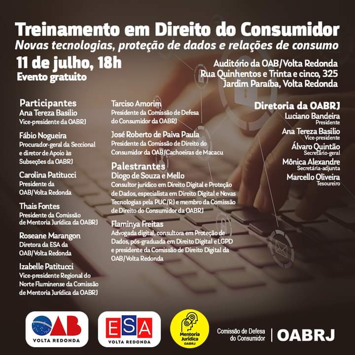 Vice-presidente da OAB-RJ e presidente da comissão de celeridade processual, Ana Tereza Basilio vai participar,  nesta terça-feira,  dia 11de julho,  às 18h, do Treinamento Permanente em Direito do Consumidor,  no auditório da OAB de Volta Redonda, com o tema “Novas Tecnologias, proteção de dados e relações de consumo”.