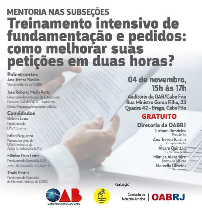 Vice-presidente da OAB-RJ e presidente da comissão de celeridade processual, Ana Tereza Basílio participa, na sexta-feira, 4, do “Treinamento Intensivo de fundamentação e pedidos: Como melhorar suas petições em duas horas”, que acontece no auditório da OAB de Cabo Frio, com a participação do presidente da comissão de estudos em processo civil da seccional, José Roberto Mello Porto, e terá como convidados a presidente da comissão de Mentoria Jurídica, Thais Fontes, e o procurador-geral da entidade, Fábio Nogueira.