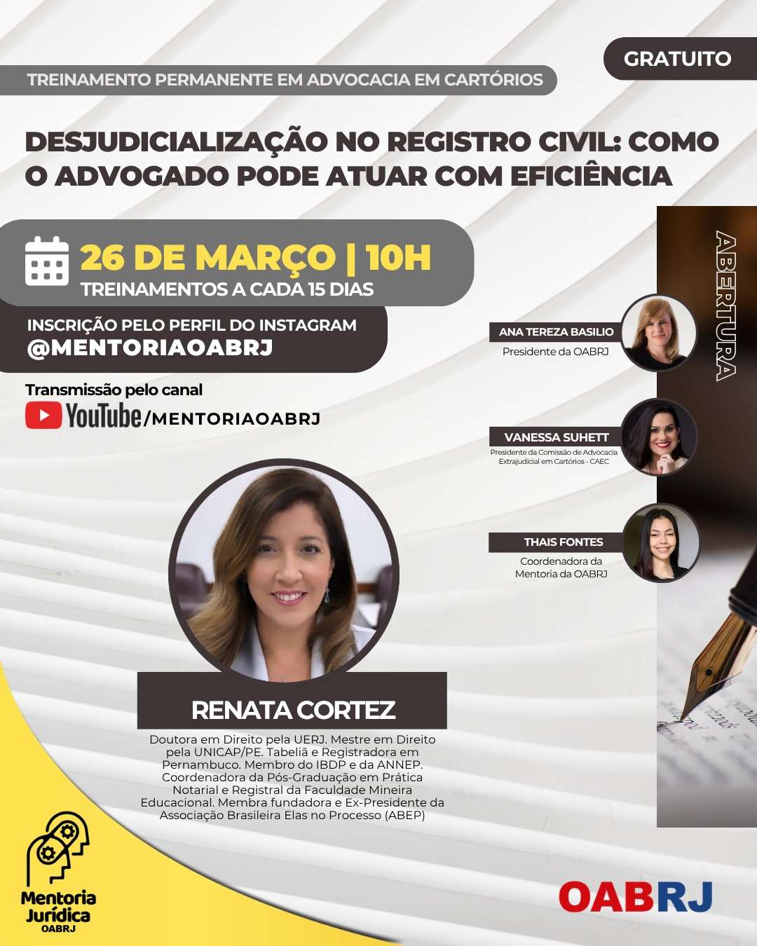 Também estarão no encontro virtual e gratuito, a Coordenadora da Mentoria da OAB-RJ, Thais Fontes, e as advogadas Vanessa Suhet e Renata Cortez.