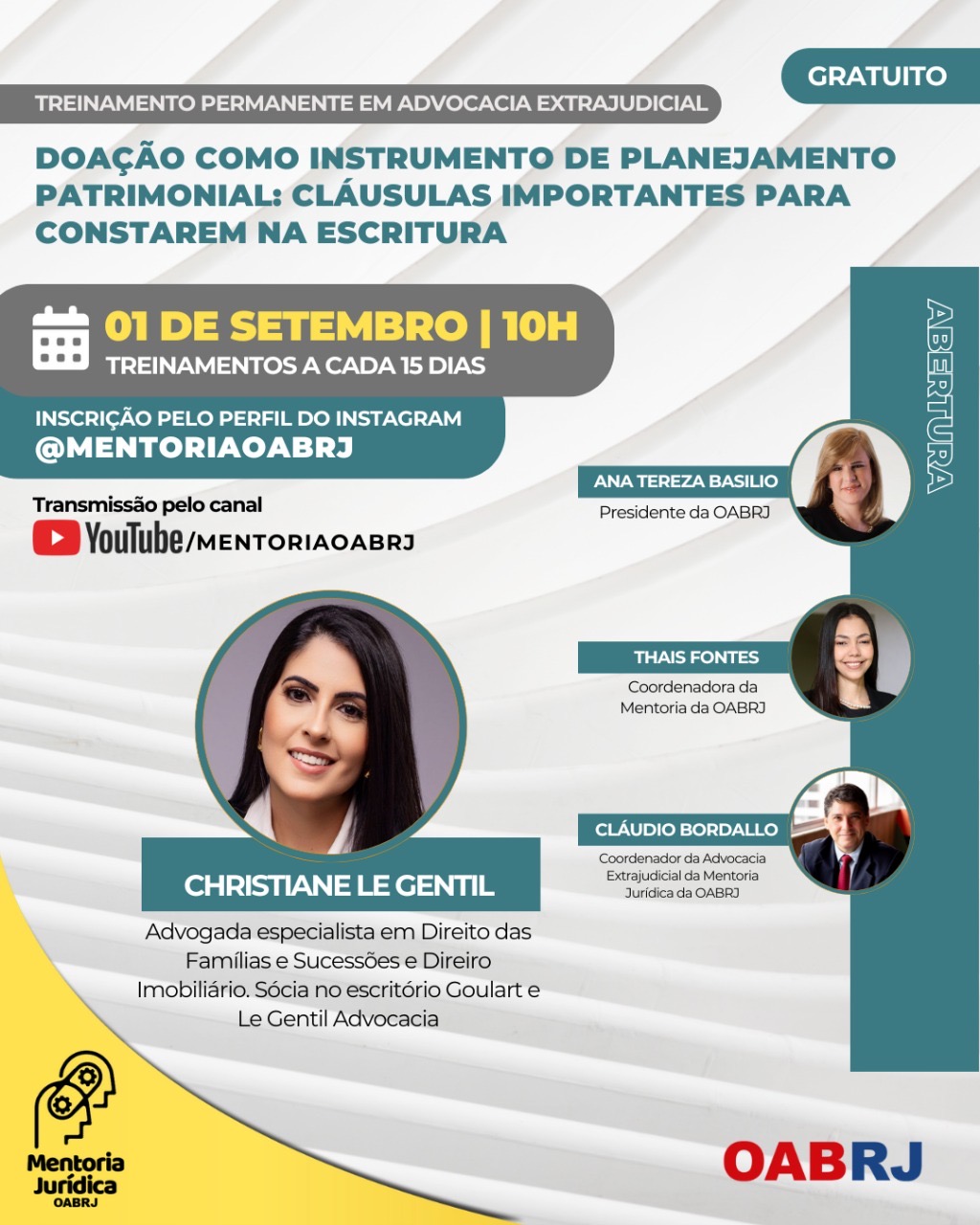 Presidente da OAB-RJ, Ana Tereza Basílio vai proferir a palestra de abertura do Treinamento Permanente em Advocacia Extrajudicial, na segunda-feira, dia primeiro de setembro, às 10h, pelo canal YouTube mentoriaoabrj, com o tema ” Doação Patrimonial: Cláusulas Importantíssimo para constarem na escritura”.