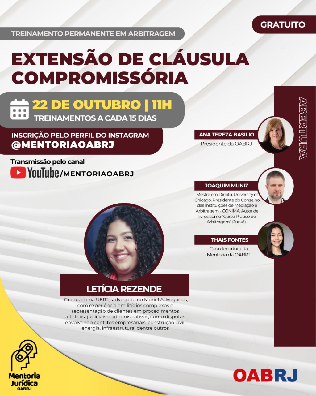Também estarão no encontro virtual e gratuito, a Coordenadora da Mentoria da OAB-RJ, Thais Fontes , o mestre em Direito e Advogado Joaquim Muniz, e a advogada Letícia Rezende.