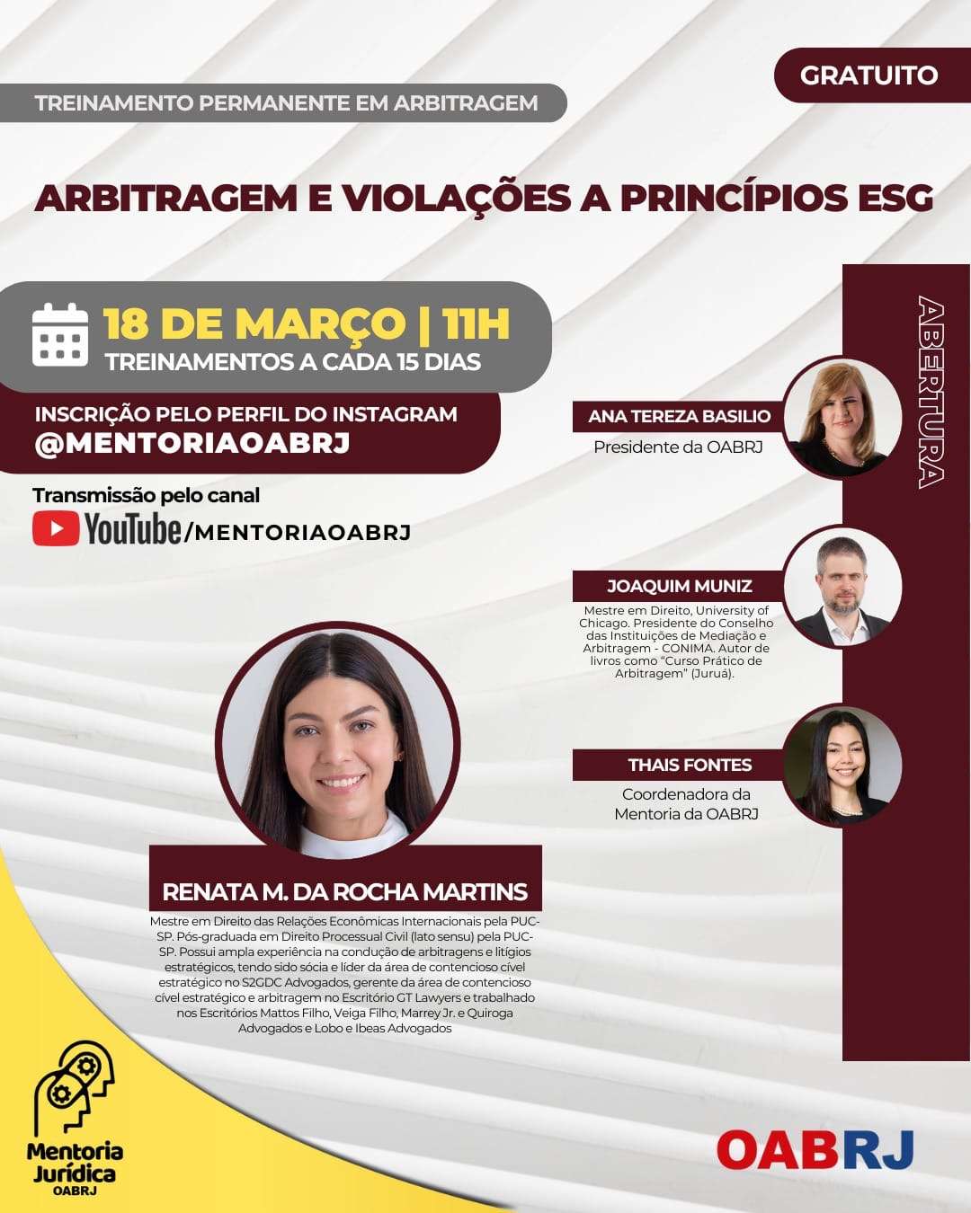 Também estarão no encontro virtual e gratuito, a coordenadora da Mentoria da OAB-RJ, Thais Fontes, o Mestre em Direito, Joaquim Muniz, e a Mestre em Direito das Relações Econômicas Internacionais, Renata M. da Rocha Martins (foto).