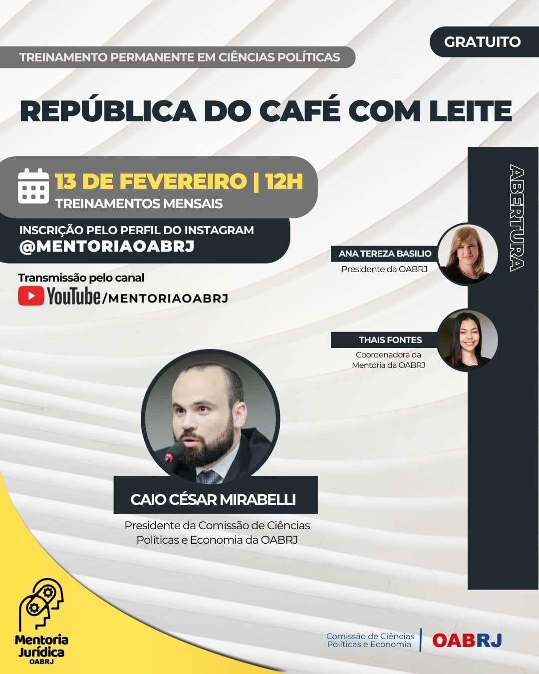 Presidente da OAB-RJ, Ana Tereza Basílio vai proferir a palestra de abertura do Treinamento Permanente em Ciências Políticas, nesta sexta-feira, dia 13 de fevereiro, às 12h, pelo canal YouTube mentoriaoabrj, com o tema “República do Café com Leite”.