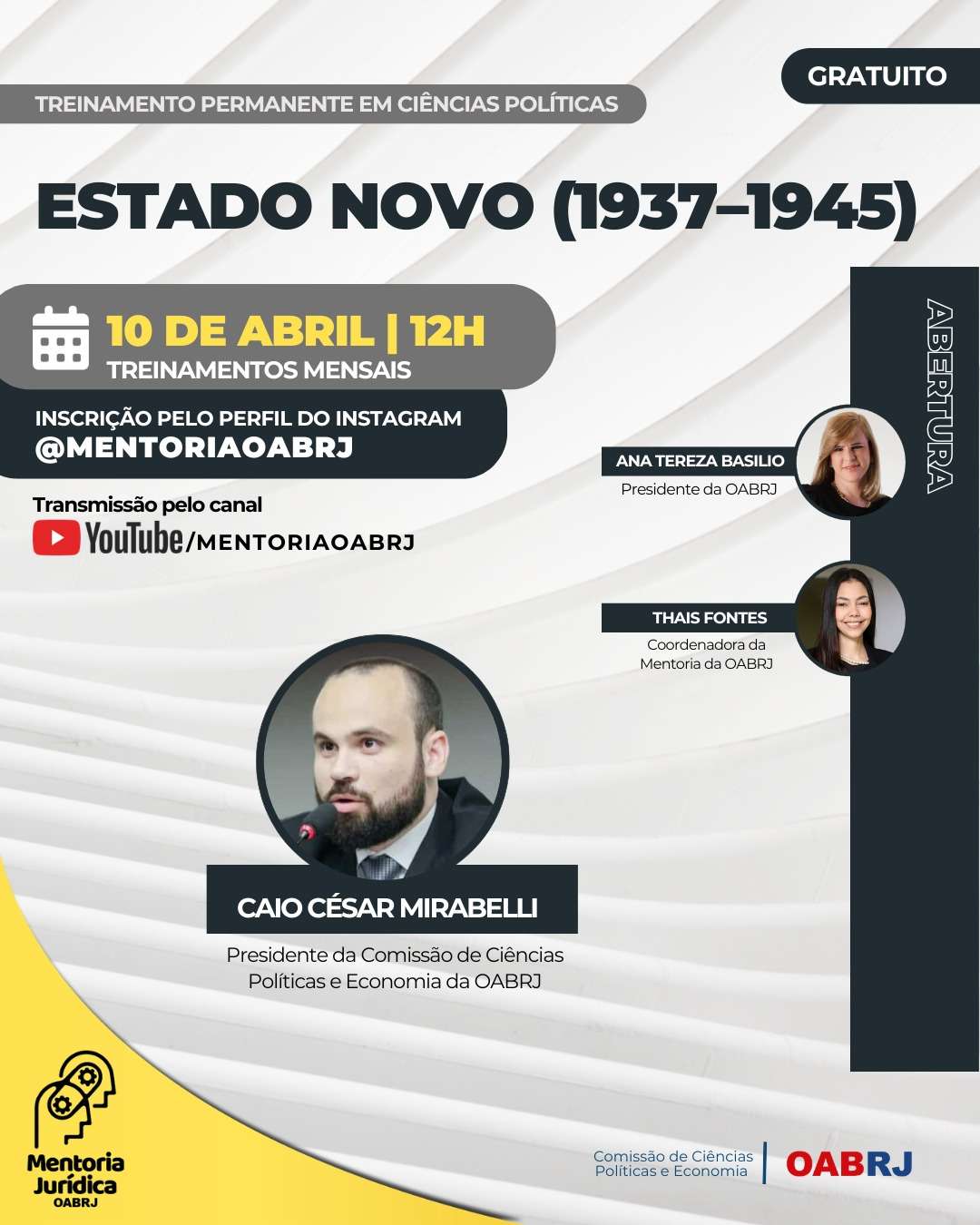 Também estarão no encontro virtual e gratuito, a coordenadora da Mentoria da OAB-RJ, Thais Fontes, e o advogado Caio Mirabelli.