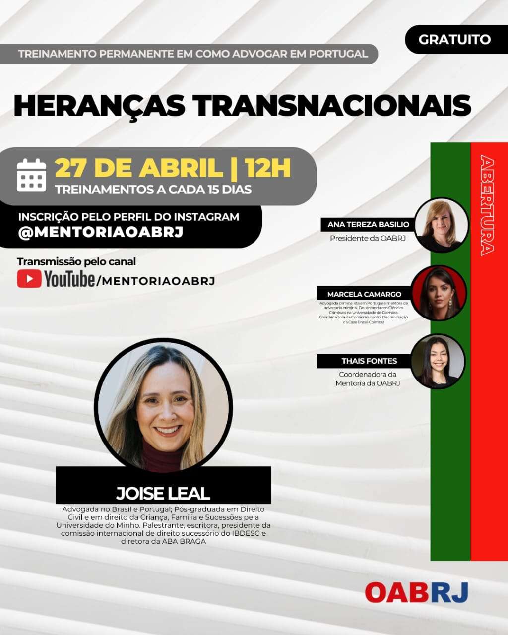 Presidente da OAB-RJ, Ana Tereza Basílio vai proferir palestra, nesta segunda-feira, dia 27 de abril, às 12h, no Treinamento Permanente em como advogar em Portugal, pelo canal YouTube mentoriaoabrj, com o tema “Heranças Transacionais”.