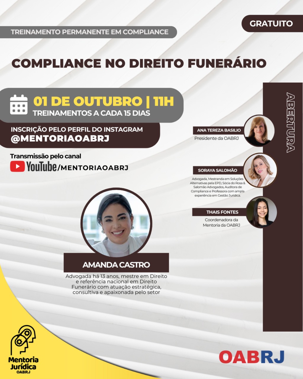Também estarão no encontro virtual e gratuito,  a Coordenadora da Mentoria da OAB-RJ, Thais Fontes, e as advogadas Soraya Salomão e Amanda Castro (fotos).