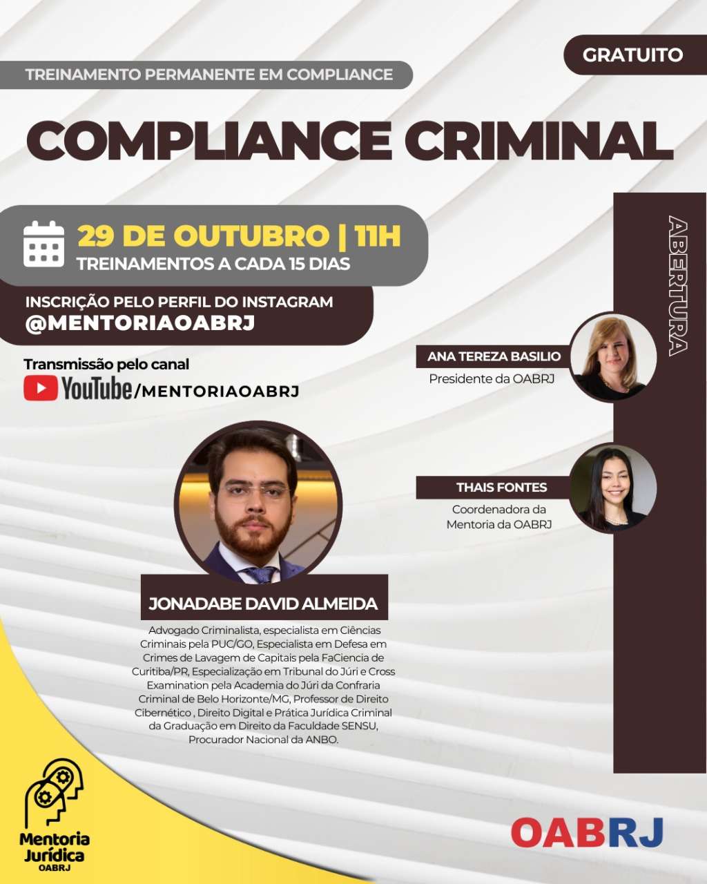 Também estarão no encontro virtual e gratuito, a Coordenadora da Mentoria da OAB-RJ, Thais Fontes, e o advogado Jonadabe David Almeida.