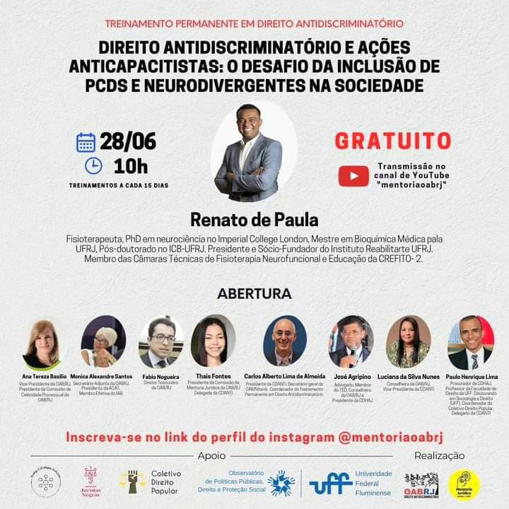 Também estarão no encontro virtual, o Diretor Tesoureiro da OAB-RJ, Fabio Nogueira, a presidente da comissão de Mentoria Jurídica, Thaís Fontes, o presidente da comissão de Direito Antidiscriminatório e coordenador do Treinamento, Carlos Alberto Lima de Almeida, do presidente da CDHAJ, José Agripino, da Diretora-Adjunta, Mônica Alexandre, da advogada Luciana Silva, do PhD em Neurociência no Imperial College London, mestre em Bioquímica Médica pela UFRJ, entre outras qualificações, e do procurador da COHAJ, Paulo Henrique Lima .
