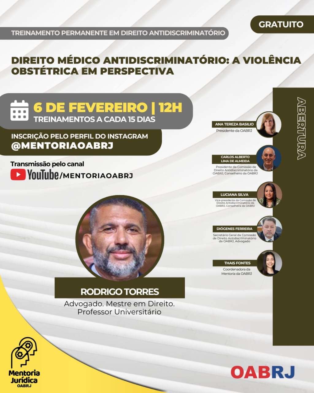 Também estarão no encontro virtual e gratuito, a Coordenadora da Mentoria da OAB-RJ, Thais Fontes, o presidente da comissão de Direito Antidiscriminatório, Carlos Alberto Lima, a vice-presidente, Luciana Silva, o secretário-geral, Diógenes Ferreira, e o advogado Rodrigo Torres, Mestre em Direito, Professor Universitário.