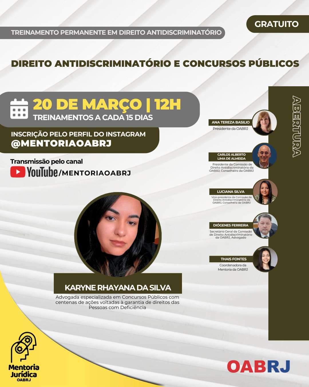 Também estarão no encontro virtual e gratuito, a Coordenadora da Mentoria da OAB-RJ, Thais Fontes, e os advogados Carlos Alberto Lima de Almeida, Luciana Silva, Diógenes Ferreira e Karyne da Silva (foto).