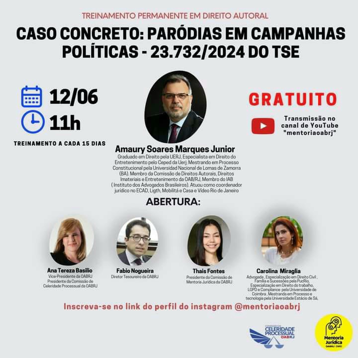 Vice-presidente da OAB-RJ, idealizadora do projeto Mentoria e presidente da comissão de celeridade processual, Ana Tereza Basílio fará a palestra de abertura, nesta quarta-feira, 12 de junho, às 11h, do Treinamento Permanente em Direito Autoral, com o tema “Caso Concreto: Paródias em Campanhas Políticas”, com transmissão pelo canal YouTube mentoriaoabrj.