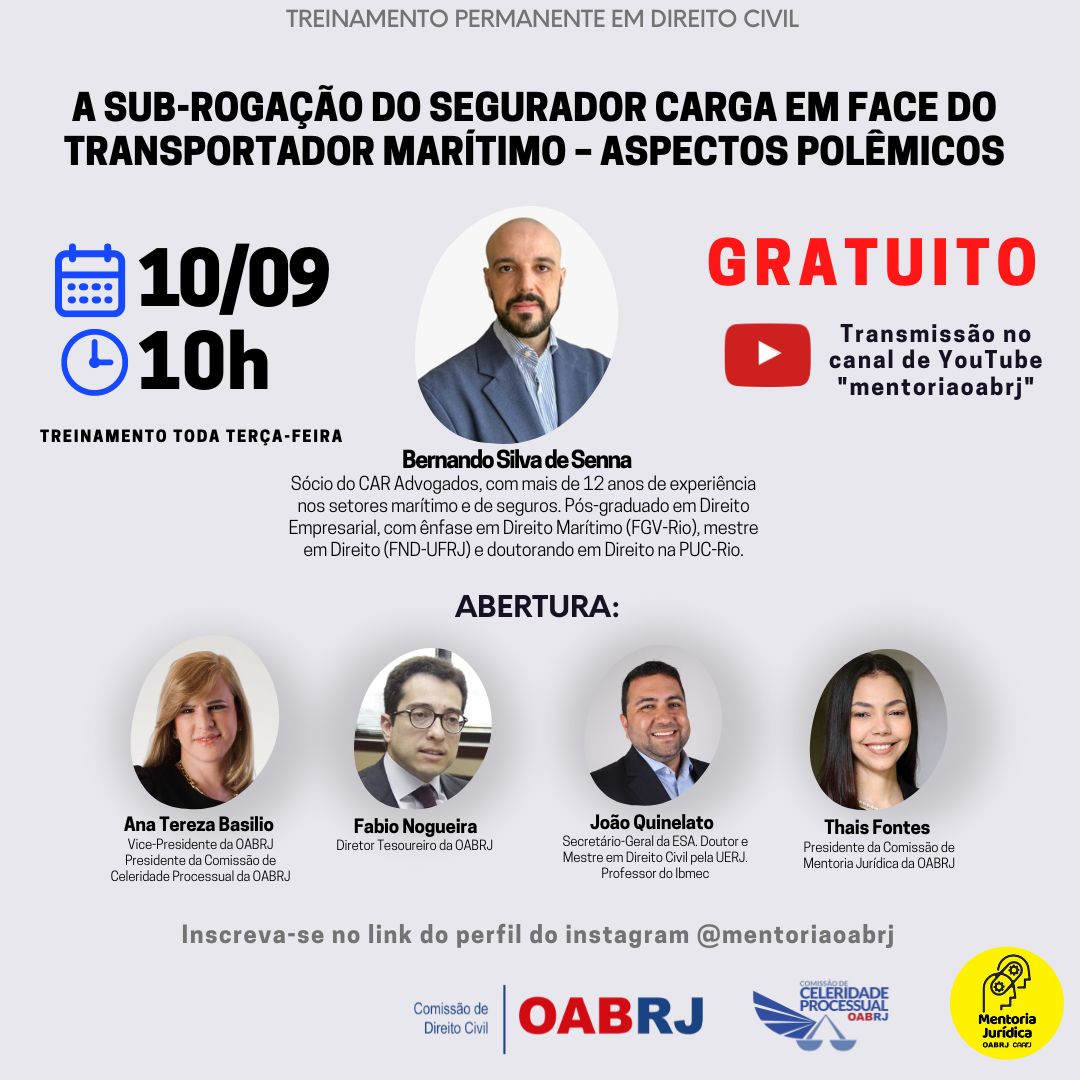 Também estarão, o advogado Bernardo Silva de Senna, o Diretor Tesoureiro da OAB-RJ, Fabio Nogueira, o secretário-geral da ESA, João Quinelato, e a presidente da comissão de Mentoria Jurídica, Thais Fontes.