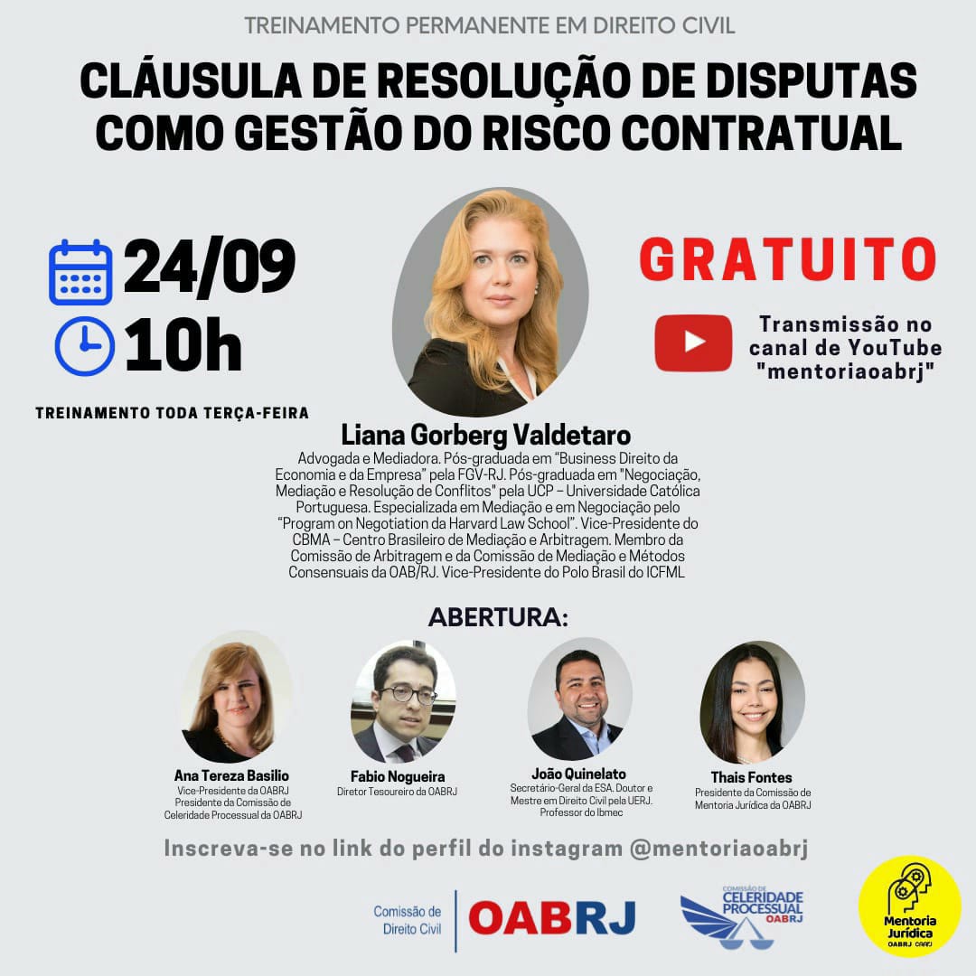 Vice-presidente da OAB-RJ e presidente da comissão de celeridade processual,  Ana Tereza Basílio vai participar,  nesta terça-feira,  às 10h,  pelo canal YouTube mentoriaoabrj,  do Treinamento Permanente em Direito Civil,  com o tema ” Cláusula de Resolução de Disputas como gestão do risco contratual “.