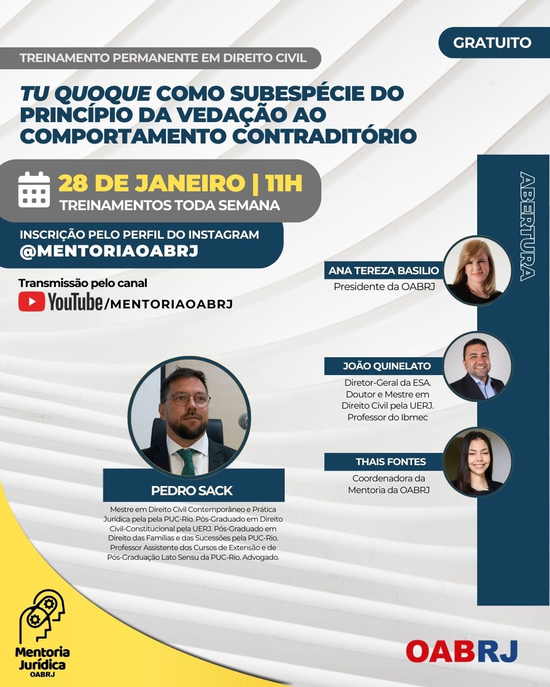 Também estarão no encontro virtual e gratuito, a Coordenadora da Mentoria da OAB-RJ, Thais Fontes, o Diretor geral da ESA-RJ e mestre em Direito Civil pela pela UERJ, João Quinelato, e o professor e advogado, Pedro Sack.