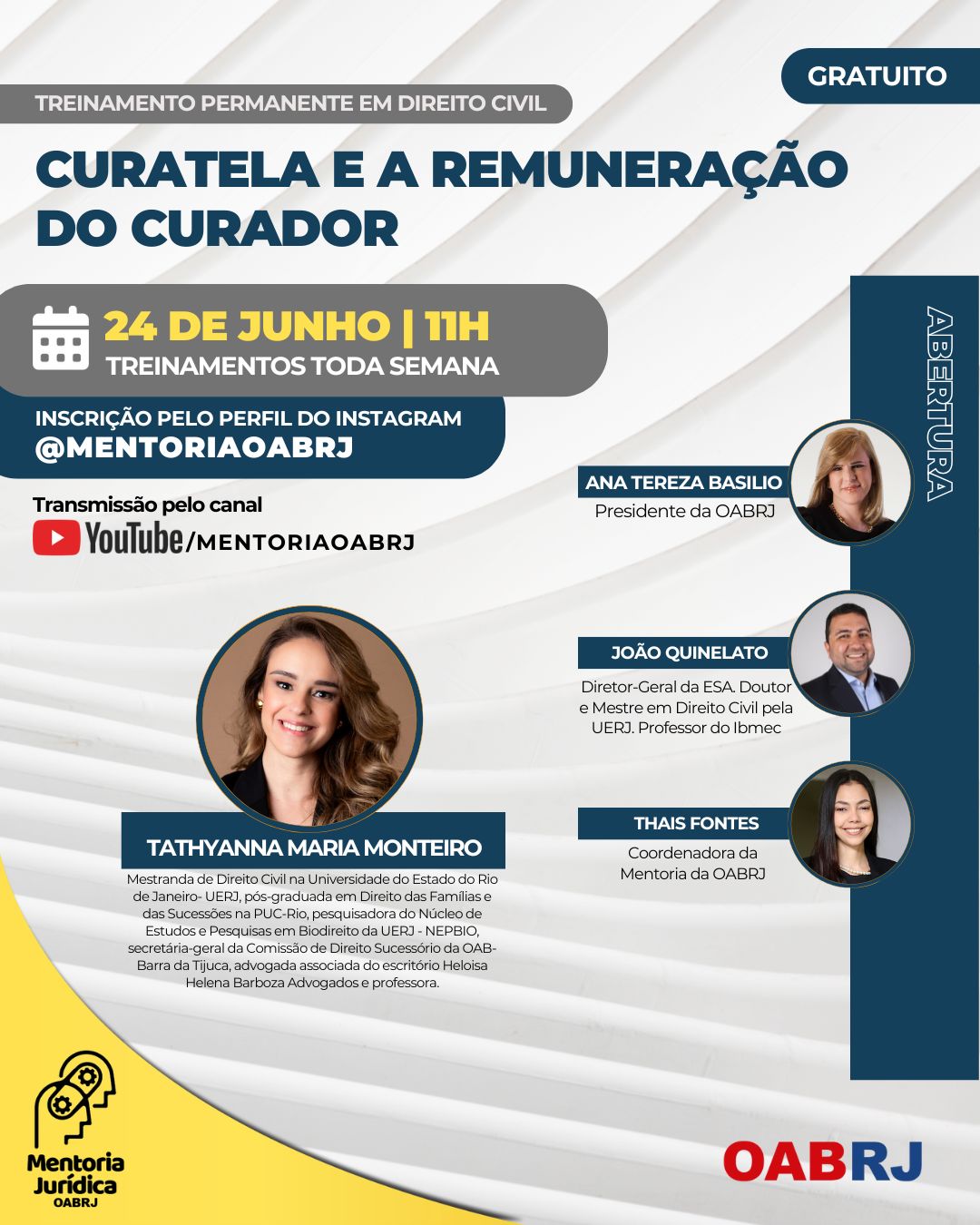 Também estarão no encontro virtual e gratuito, a advogada Tathyanna Maria Monteiro, o Diretor-geral da ESA-RJ, João Quinelato, e a Coordenadora da Mentoria da OAB-RJ, Thais Fontes .
