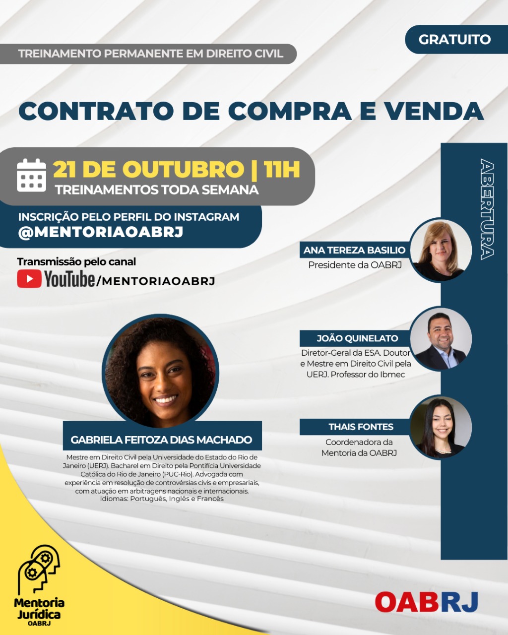 Também estarão no encontro virtual e gratuito, a Coordenadora da Mentoria da OAB-RJ, Thais Fontes, o Diretor-geral da ESA-RJ, João Quinelato, e a mestre em Direito Civil e advogada Gabriela Machado.