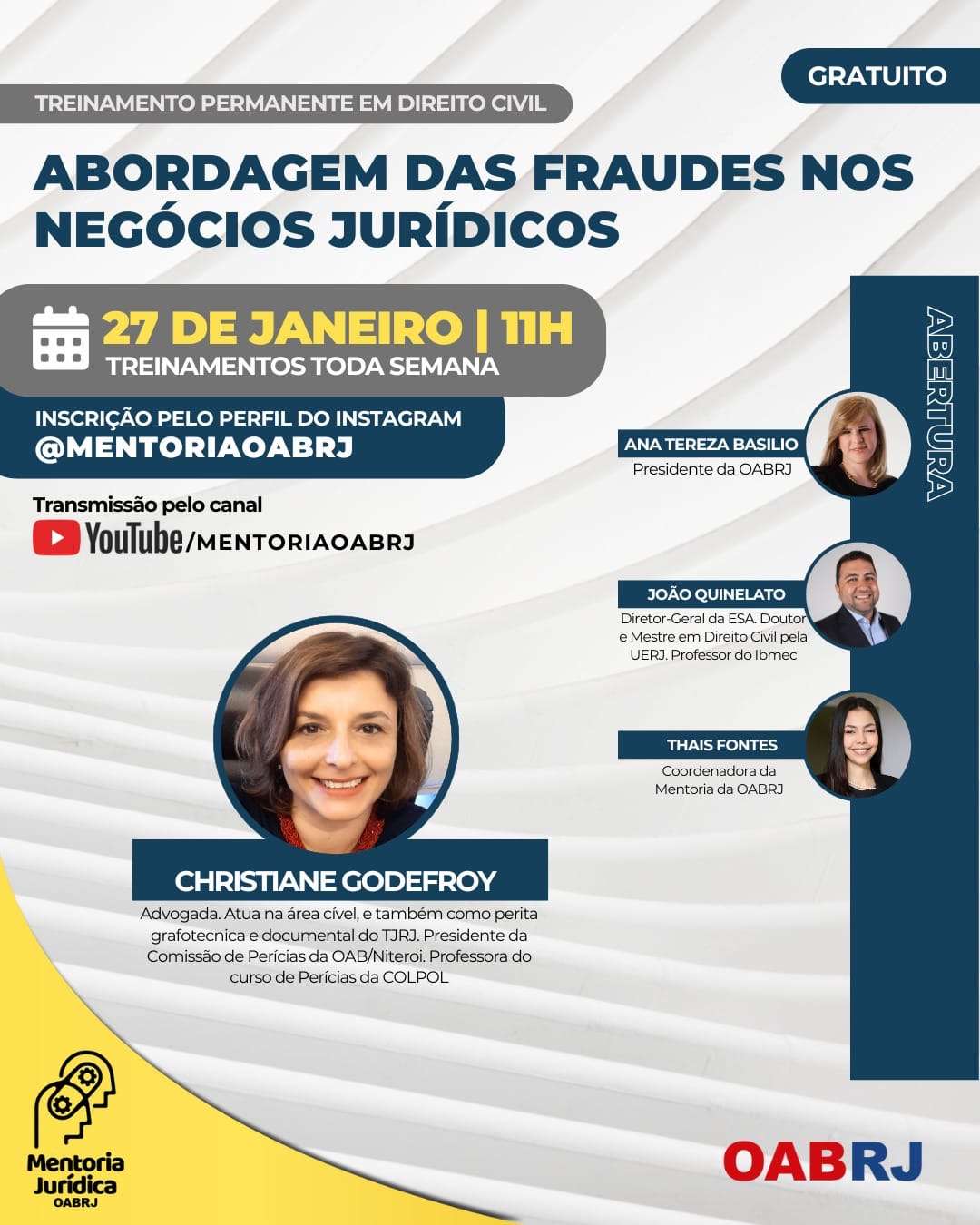 Também estarão no encontro virtual e gratuito, o Diretor-geral da ESA-RJ, João Quinelato, a Coordenadora da Mentoria da OAB-RJ, Thais Fontes, e a advogada Christiane Godefroy.