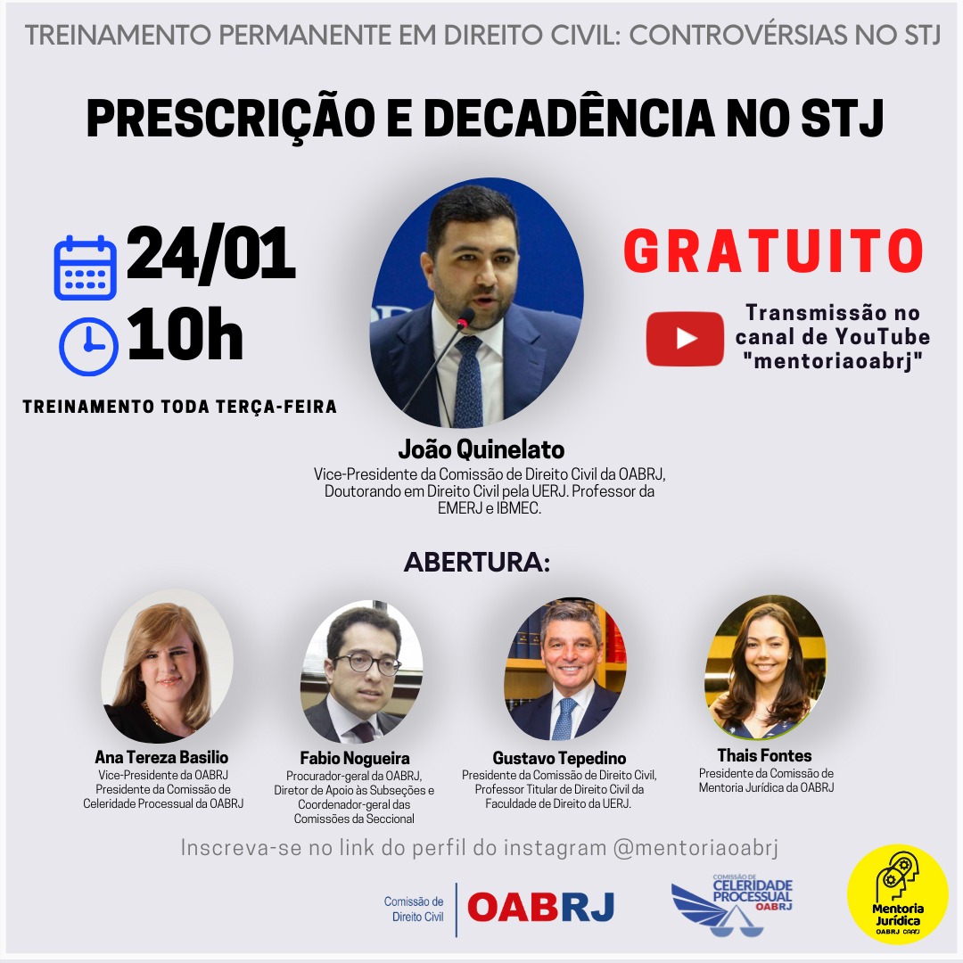 Também estarão no encontro virtual, o Procurador-Geral da OAB-RJ,  Fábio Nogueira, a presidente da comissão de Mentoria Jurídica , Thaís Fontes, e os advogados Gustavo Tepedino e João Quinelato, respectivamente,  presidente e vice-presidente da comissão de Direito Civil da seccional.