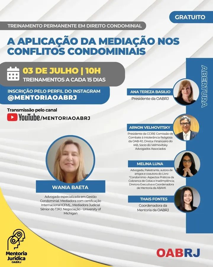 Também estarão no encontro virtual e gratuito, a Coordenadora da Mentoria da OAB-RJ, Thais Fontes, o presidente da comissão de Combate à Intolerância Religiosa, Arnon Velmovitsky, a advogada Melina Luna e a advogada Wania Baeta.
