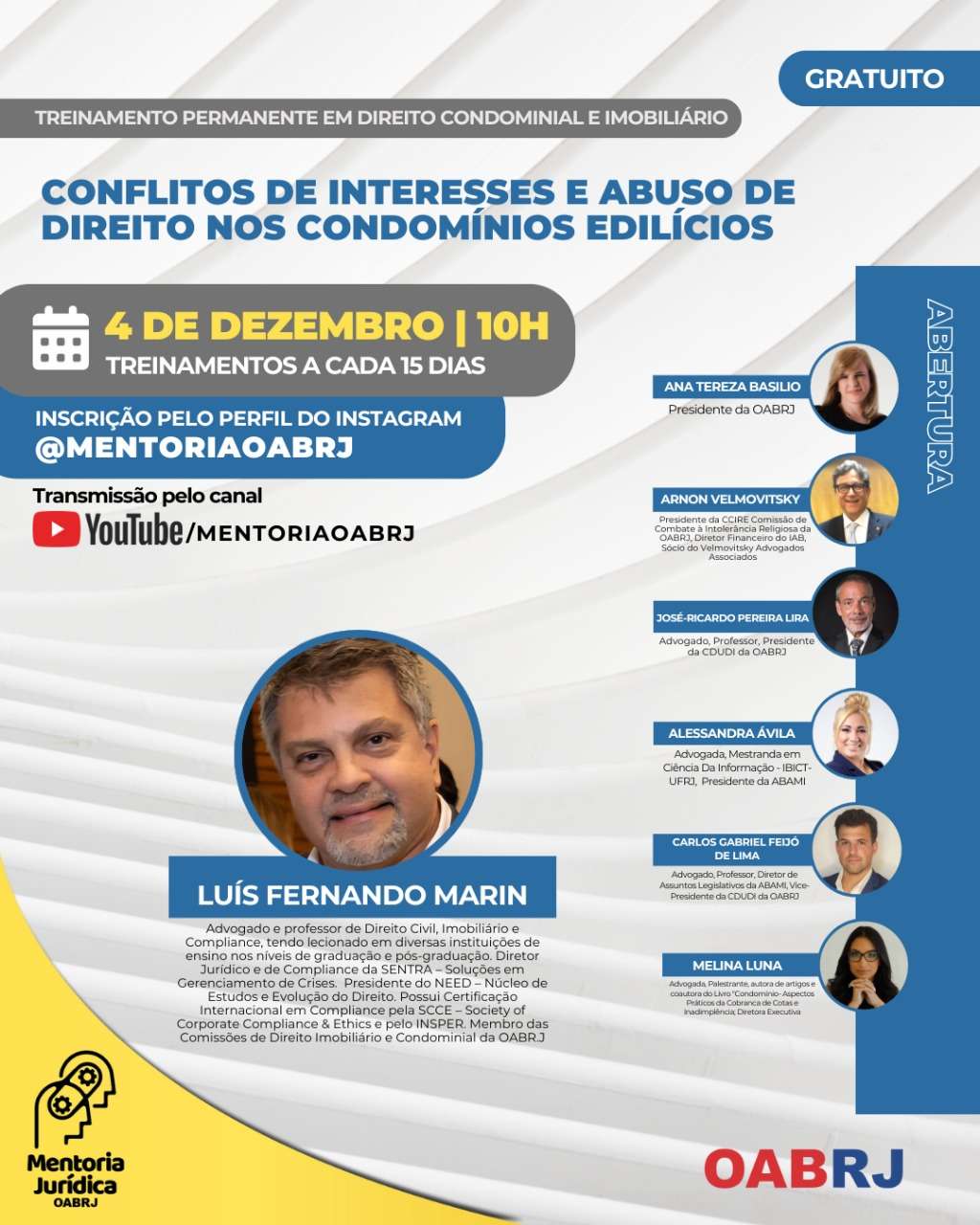 Também estarão no encontro virtual e gratuito, o presidente da comissão de Combate à Intolerância Religiosa, Arnon Velmovitsky, o presidente da CDUDI da OAB-RJ, José-Ricardo Pereira Lira, a advogada Alessandra Ávila, o advogado Carlos Gabriel Feijó, a advogada Melina Luna e o advogado Fernando Marin.
