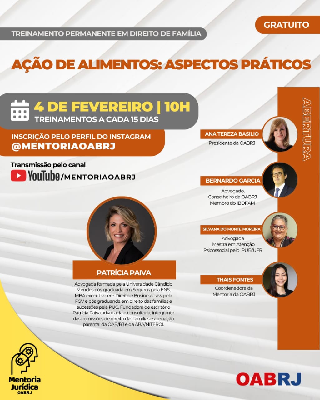 Também estarão no encontro virtual e gratuito, a Coordenadora da Mentoria da OAB-RJ, Thais Fontes, as advogadas Silvana do Monte Moreira e Patrícia Paiva e o advogado Bernardo Garcia.