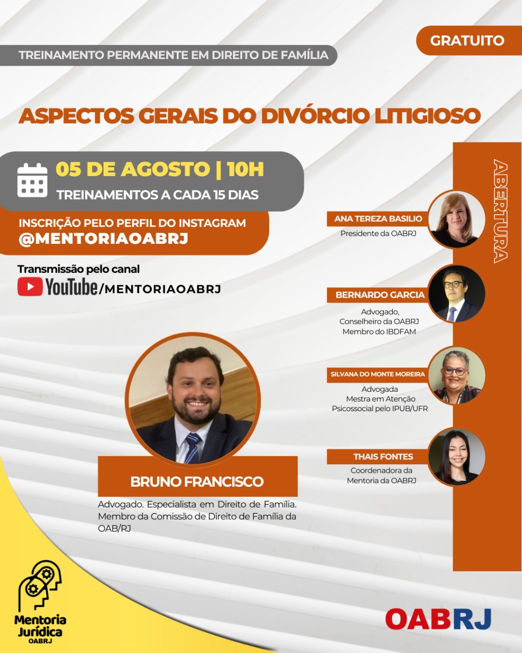 Também estarão no encontro virtual e gratuito, a Coordenadora da Mentoria da OAB-RJ, Thais Fontes, e os advogados Bernardo Garcia, Silvana do Monte Moreira e Bruno Francisco (foto).